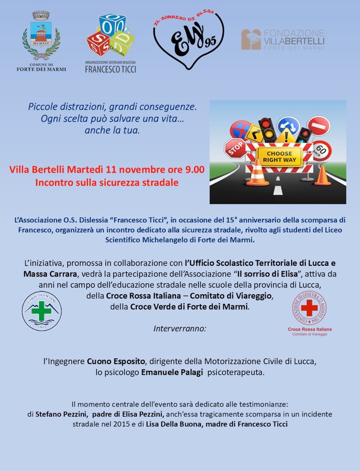 L’evento, in programma martedì 11 novembre alle ore 9.00 a Villa Bertelli, sarà dedicato alla Sicurezza Stradale. L’incontro, rivolto agli studenti del Liceo Scientifico Michelangelo e realizzato in collaborazione con l’Ufficio Scolastico Territoriale di Lucca e Massa Carrara, coinvolgerà l’Associazione “Il sorriso di Elisa”, la Croce Rossa Italiana – Comitato di Viareggio e la Croce Verde di Forte dei Marmi, cui va il ringraziamento della OSD Francesco Ticci. Interverranno l’ingegner Esposito Cuono, dirigente della Motorizzazione Civile di Lucca, e lo psicologo e psicoterapeuta Emanuele Palagi, ma soprattutto forniranno la loro testimonianza Stefano Pezzini, padre di Elisa Pezzini, e Lisa Della Buona, madre di Francesco Ticci.